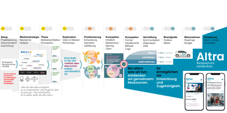 Das Rebranding umfasste mehr als eine visuelle Neugestaltung. LoF* führte Altra durch einen umfassenden Veränderungsprozess, der die historisch gewachsenen und teils eigenständigen Bereiche in eine gemeinsame Mission überführte. Diese Neupositionierung wurde partizipativ gestaltet und stellte die Bedürfnisse der Menschen in den Mittelpunkt. Von Stakeholder-Management über Moderation bis hin zur konkreten Massnahmenplanung – jeder Schritt zielte darauf ab, ein inklusives Mindset nachhaltig zu verankern.